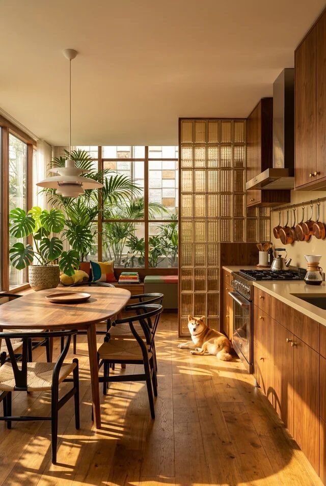 Pendant lights here are sculptural, not just functional. Mid-century lighting doubles as art, so choose pieces with shape and presence. Also notice how the island aligns with window frames. Alignment creates subconscious order. When architectural lines and furniture placement echo each other, the space feels effortlessly composed.
