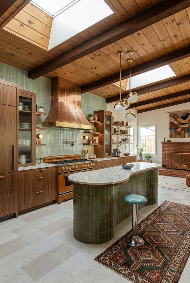 This kitchen understood the assignment: curves, color, and confidence. The rounded green-tiled island instantly softens the boxy cabinetry and beams overhead. Curves are a secret weapon in mid-century modern design because they counterbalance all the linear architecture. If we want this look, consider a curved peninsula or even rounded countertop edges.