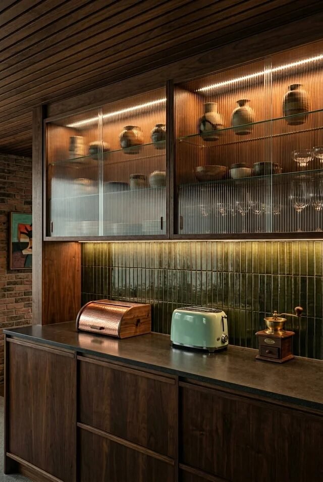This one is for the mid-century purists who like their kitchens a little dramatic. Dark walnut cabinetry paired with ribbed glass fronts creates depth without chaos. Ribbed or fluted glass adds texture while subtly concealing clutter, which is genius for upper cabinets.