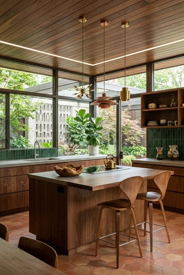 This kitchen is basically mid-century modern flirting with a greenhouse, and honestly? We’re here for it. The warm walnut cabinetry paired with full-height windows creates that classic MCM harmony between indoors and out. Mid-century design is obsessed with connection to nature, so maximizing natural light is not optional—it’s the whole mood. If we’re recreating this, start with flat-panel wood cabinets in a medium-to-warm tone and keep hardware minimal so the grain can shine.