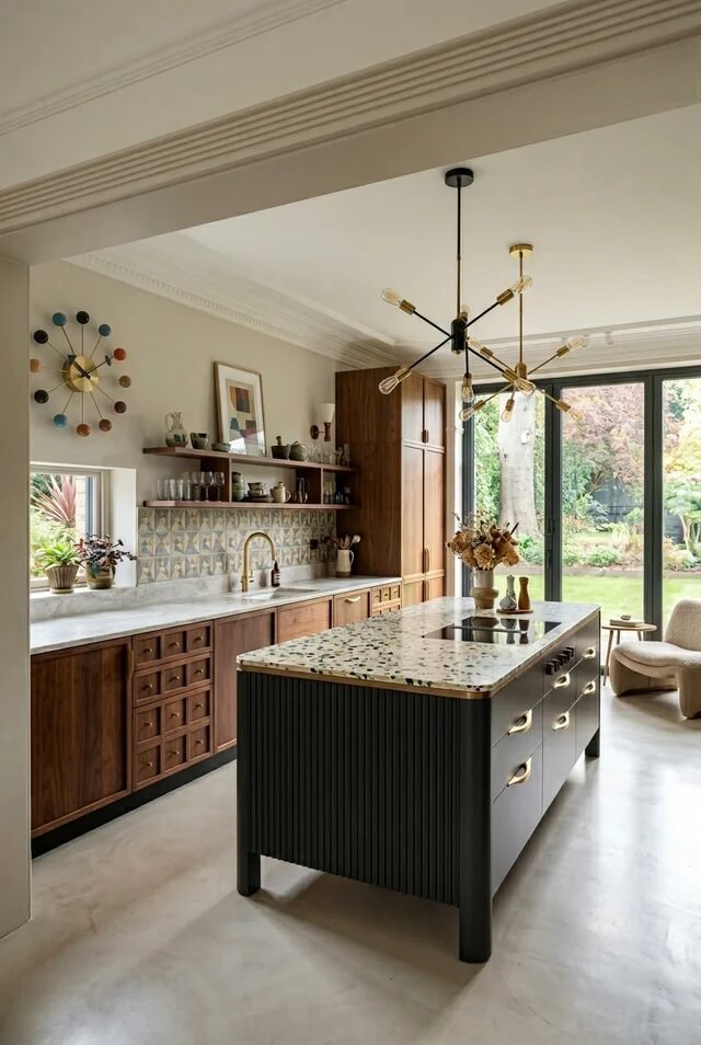 The terrazzo-style countertop adds playful texture without overpowering. When mixing eras, unify them through material repetition and consistent undertones. Warm woods plus warm metals equals harmony. Add one sculptural light fixture, and suddenly your kitchen feels collected, not chaotic.