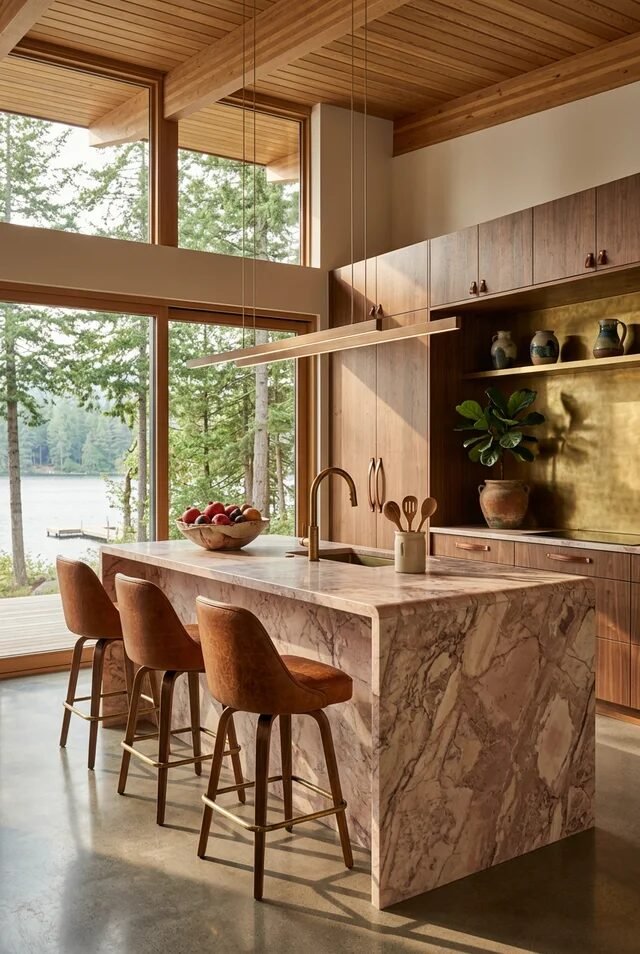 Floor-to-ceiling windows frame the outdoors like living artwork. That’s biophilic design at its best. When recreating this look, prioritize sightlines. Keep upper cabinets minimal or eliminate them on window walls to maintain openness.