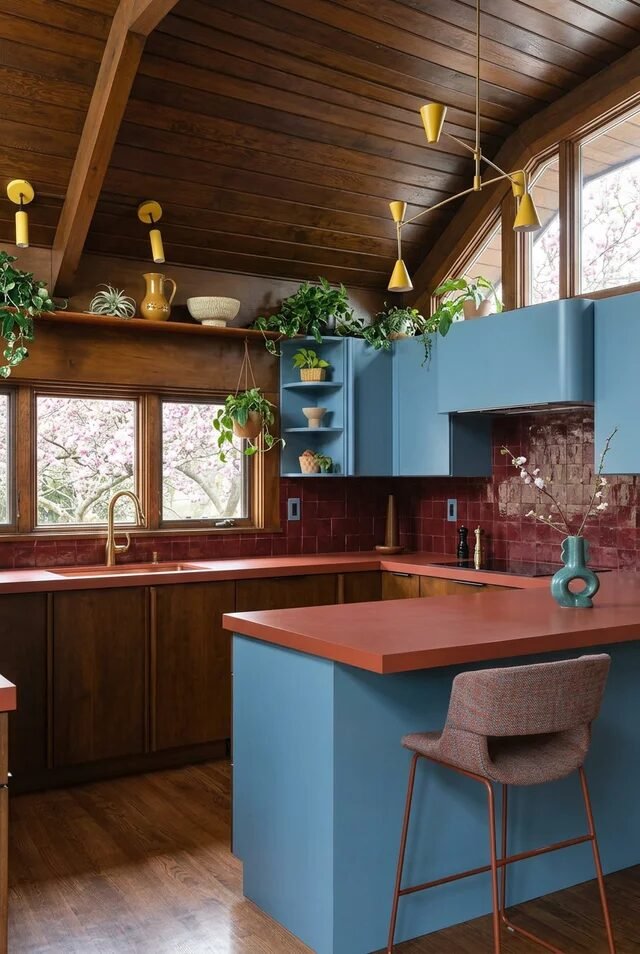 The red tile backsplash might sound risky, but it works because it’s earthy, not neon. This is color theory in action. Cool blue cabinets balance warm wood and brick-red tile, creating tension that feels intentional. If we’re copying this, stick to muted, dusty tones instead of high-saturation brights.