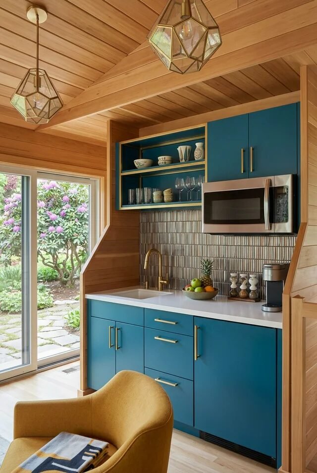 Small kitchen? No problem. This teal setup proves mid-century modern works even in compact layouts. Color can define a zone, especially in open-plan homes where walls are minimal. The rich teal cabinetry pops against honey-toned wood paneling, creating a cozy but intentional contrast.