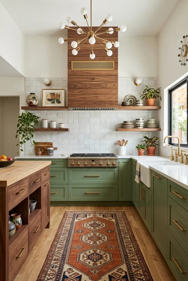 This kitchen feels like mid-century modern grew up and started buying houseplants in bulk. The sage green lower cabinets ground the room while walnut uppers and range hood add depth. Two-tone cabinetry works best when one color is earthy and the other is natural wood. It keeps contrast soft and livable.