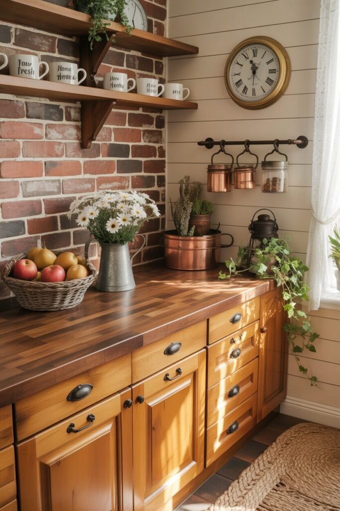 If your dream kitchen looks like a vintage coffee shop tucked inside an old barn, you’re going to love this. The brick backsplash adds texture and visual interest while those copper pans and jars reflect warmth like sunlight in the afternoon. It’s the kind of kitchen that looks even better with time.