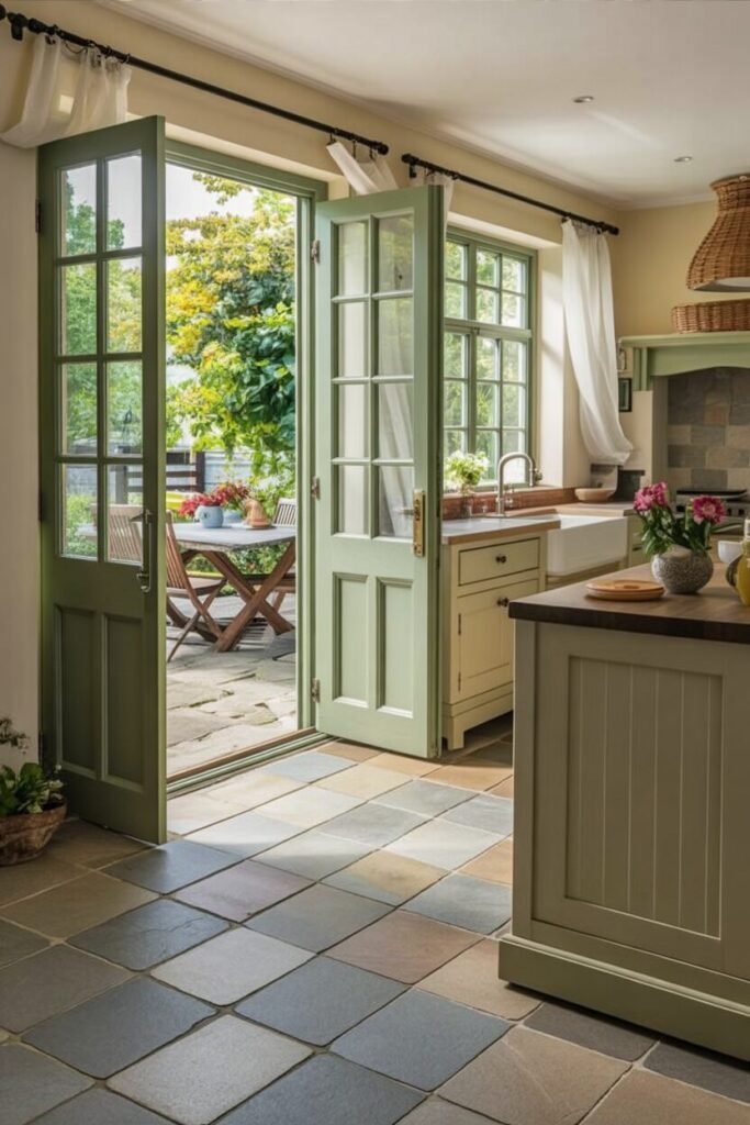 The trick lies in using similar tones and textures—notice how the green cabinetry echoes the garden view, while the stone tile complements the outdoor patio. Design principle: To create flow, repeat your main color in small elements across both spaces—window frames, textiles, and planters. Keep curtains sheer or linen to soften natural light instead of blocking it.