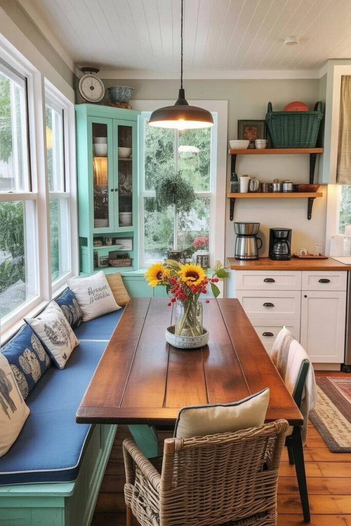 This kitchen corner feels like sunshine bottled up and poured over mint paint. The built-in banquette seating painted in mint green sets a cheerful tone, while the navy cushions and white-framed windows add a crisp coastal balance. The wooden table anchors the look with warmth, making the whole space feel like morning coffee heaven.