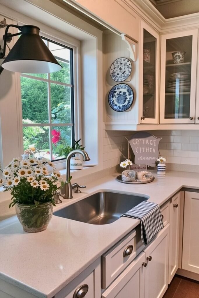 The brass faucet and black sconce inject modern balance, proving that vintage and minimal can coexist. Design principle: When working with a mostly white kitchen, use decor as punctuation—each blue plate, flower vase, and gingham towel tells a quiet story. The daisy bouquet softens the lines and adds freshness. To recreate this, think function first—keep counters clear and limit color to small accents.