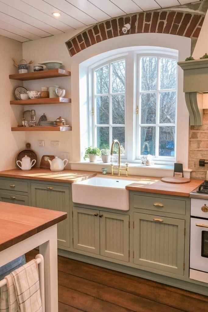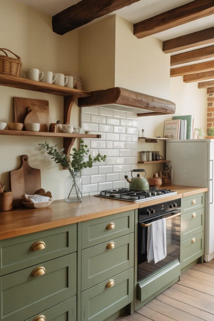 This space nails the old-meets-new cottage aesthetic—olive-green cabinets grounded with brass handles and a wooden countertop that glows under warm light. The open shelving with ceramics and cutting boards adds relaxed charm, while the exposed ceiling beams frame everything beautifully.