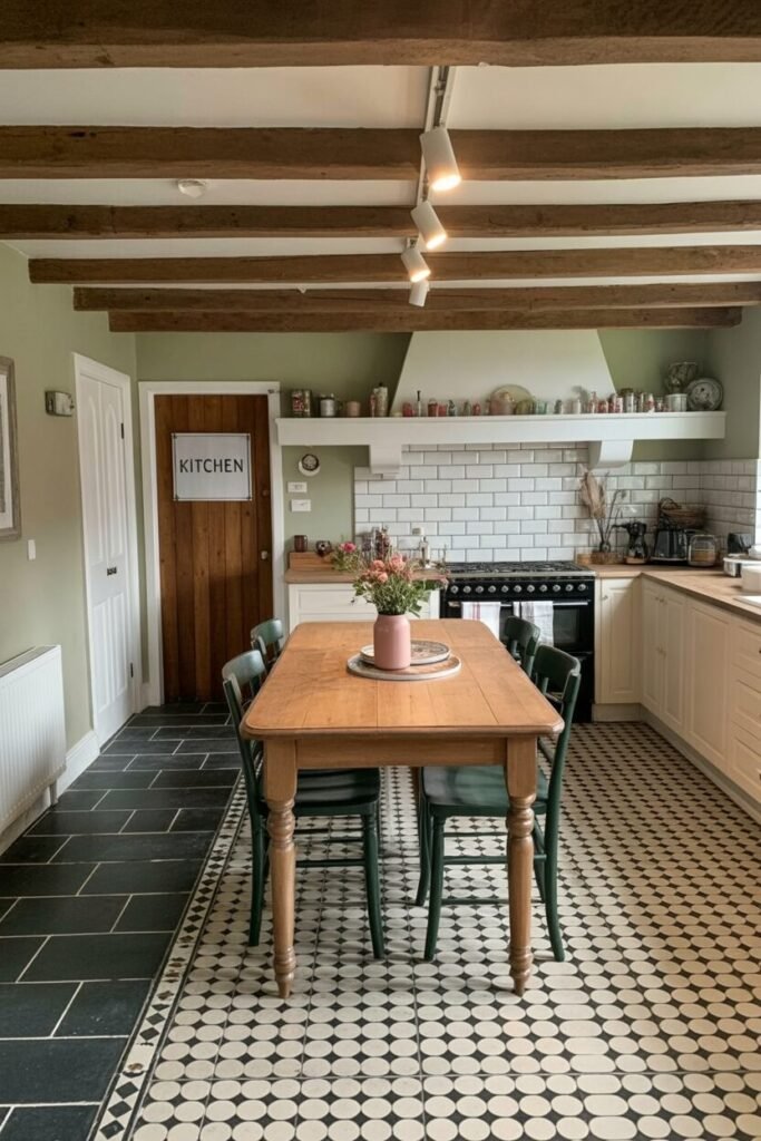This kitchen balances vintage soul and smart geometry, making it a perfect study in pattern harmony. The checkered floor tiles, white subway backsplash, and wooden beams create layers of nostalgia. The natural wood dining table centers the room, while green chairs introduce that organic pop of life.