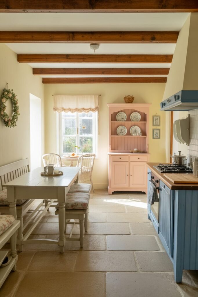 Pro tip: Soft daylight enhances pastel tones—avoid harsh LED light. Opt for cream-toned bulbs to keep that morning glow all day. Style tip: Mix eras—vintage furniture, modern light fixtures, and cottage décor—to achieve depth. This kitchen feels like a daydream come true: light, airy, and full of color harmony that soothes the soul while staying effortlessly chic.