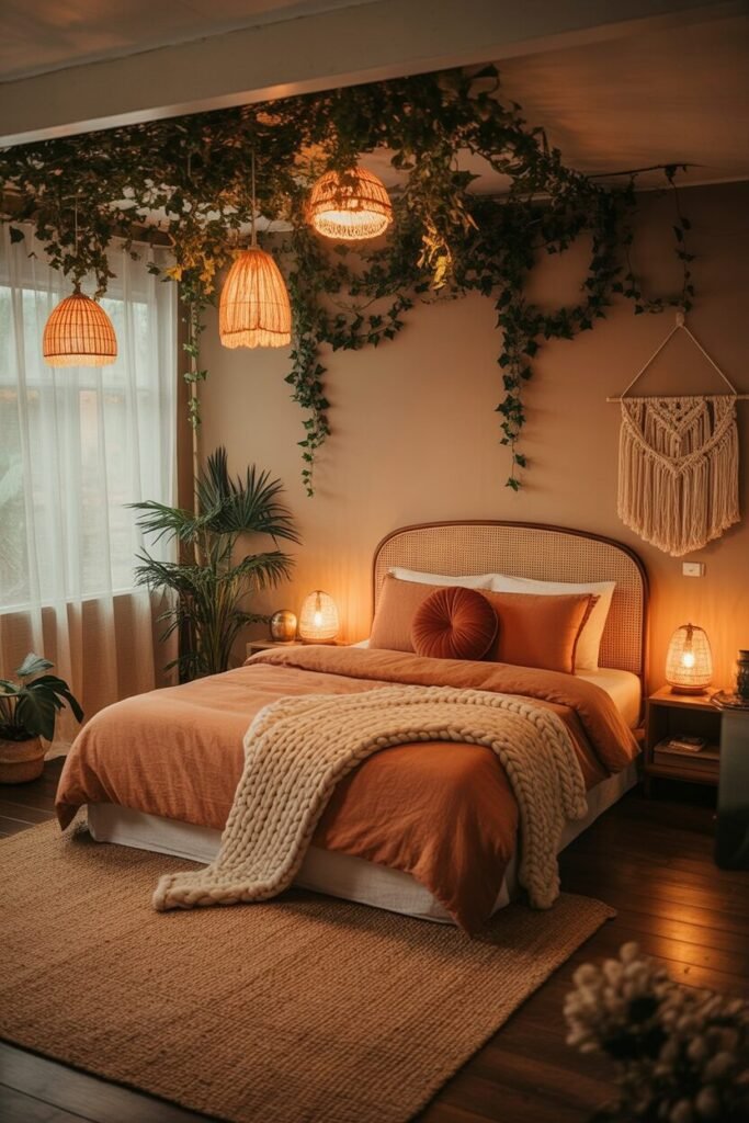 The warm amber lighting? Total mood setter. Pendant lamps in rattan diffuse light softly, creating that “golden hour even when it’s raining outside” effect. And the earthy rust bedding anchors the look, so the greenery doesn’t steal the whole show.
