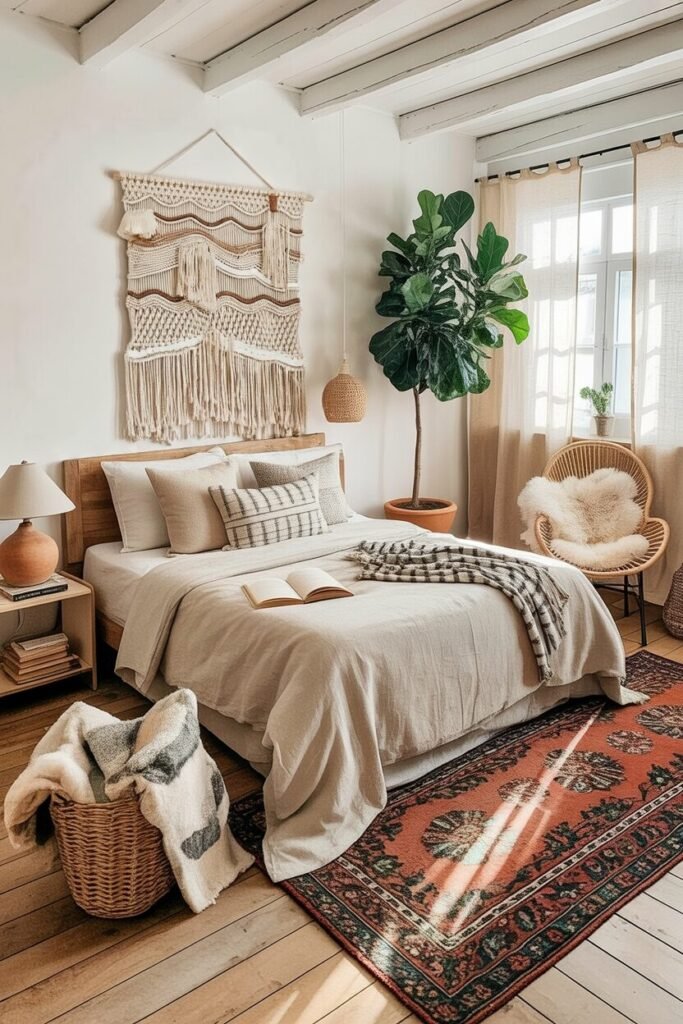 Think linen bedding, nubby throws, raw wood nightstands, and of course a chunky macramé piece anchoring the wall. To recreate this, start with natural light—sheer curtains make the room glow without sacrificing privacy. Then build your “texture pyramid”: lightweight linen at the base, mid-weight woven pillows next, and something extra-chunky draped casually (yes, “casually messy” is a design principle… kind of).