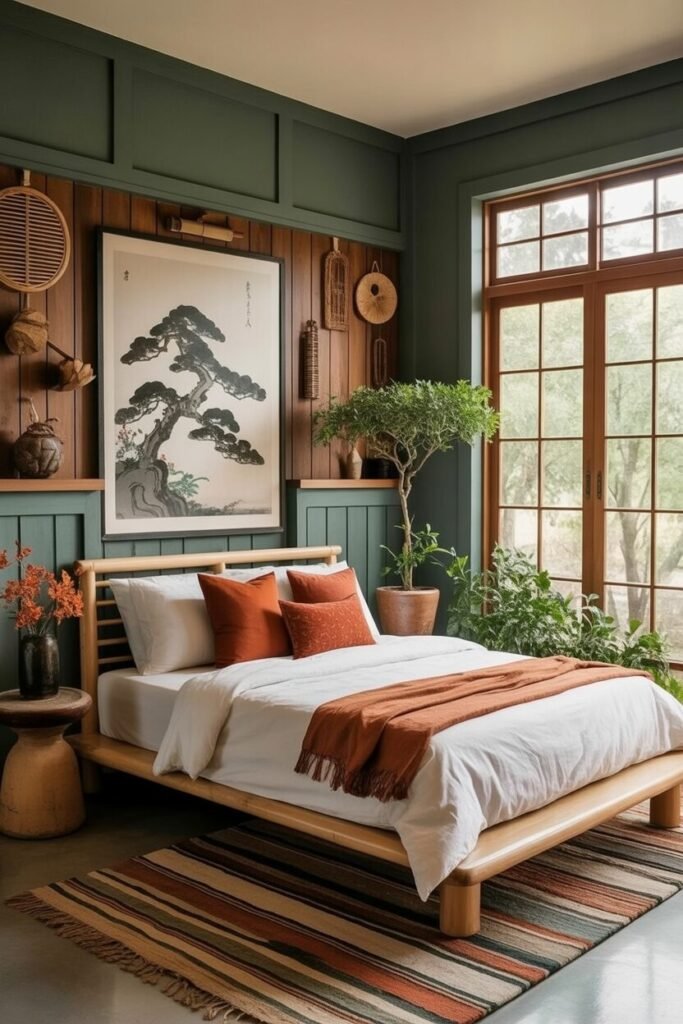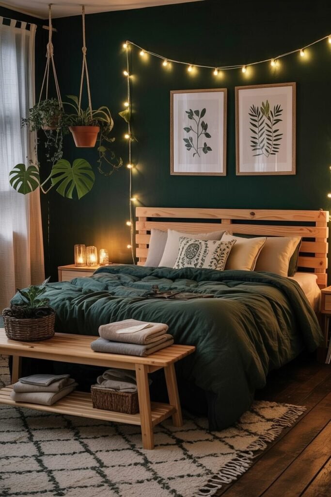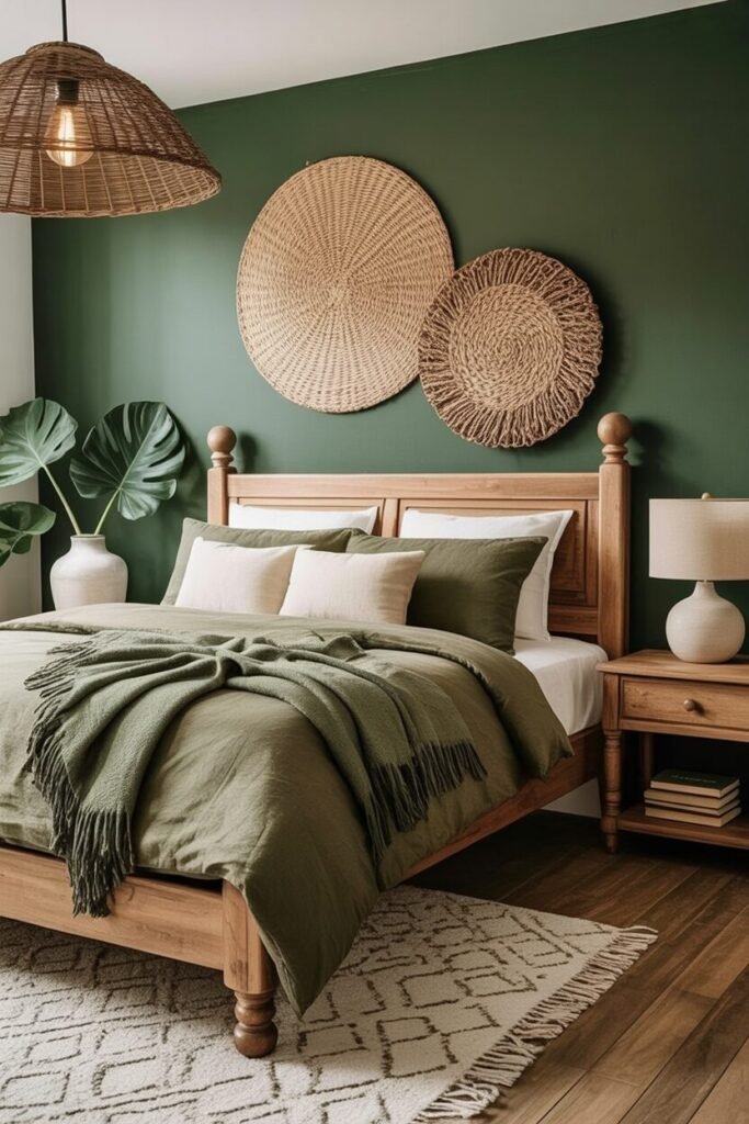 This bedroom is basically the design version of “I’m grounded, hydrated, and emotionally stable.” The deep forest-green wall sets the tone—literally. Darker walls create visual depth, making the room feel cocoon-like and calming, which is peak earthy-boho energy.