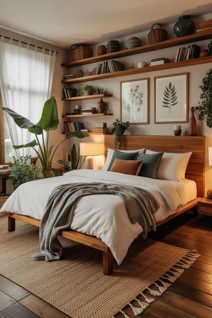 If you want your bedroom to scream “I have a skincare routine AND a library card,” this one’s for you. The design principle here is functional warmth—using décor that’s both useful and aesthetic. Floating wood shelves instantly add vertical interest while letting you display books, ceramics, plants, and random cute objects you swear “spark joy.”