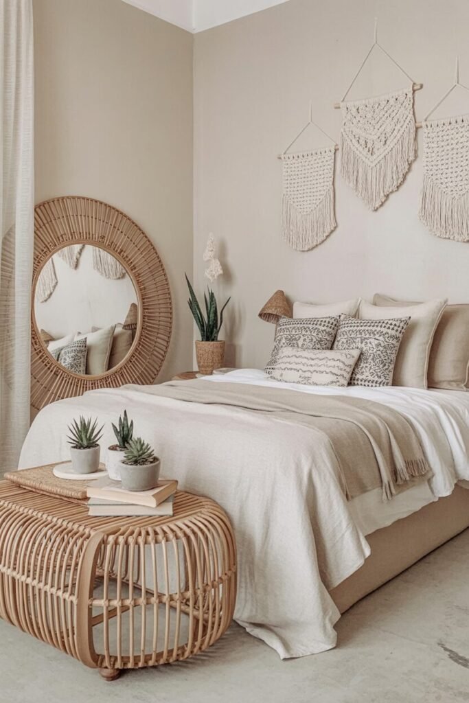 If you’ve ever wanted your bedroom to whisper, “I read self-help books and drink herbal tea,” this soft-neutral earthy boho look is it. The secret sauce behind this aesthetic? Texture > color. When we strip the palette down to creams, oatmeals, and sandy taupes, the only way to avoid a flat, boring room is to mix materials like we’re curating a tactile buffet.