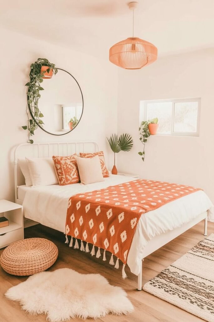 This is the bright, cheerful cousin of the earthy boho family—clean, airy, but still warm thanks to smart pops of terracotta. The white walls make the room feel wider and lighter, which lets the earthy accents shine without overwhelming the space. This is a great reminder that boho doesn’t always mean cluttered—you can go minimal and still cozy.