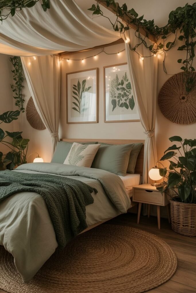 Okay, this bedroom is giving “enchanted forest but make it adulting.” The draped canopy fabric instantly softens the space by adding vertical softness and breaking up hard lines. Combined with trailing vines and layered greenery, the whole setup becomes a masterclass in biophilic design—bringing nature in to lower stress and make your sleep space feel like a spa-adjacent retreat.