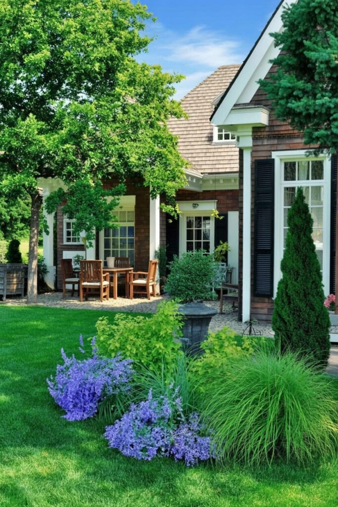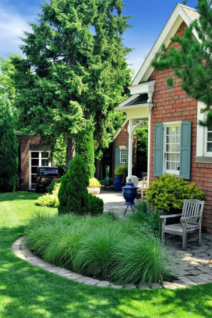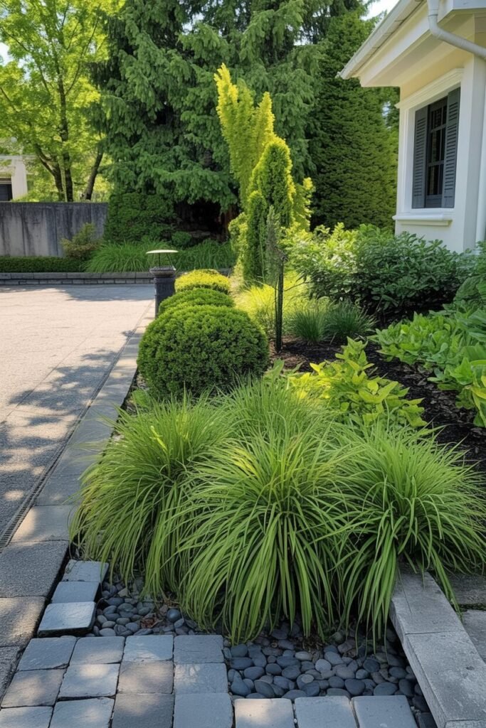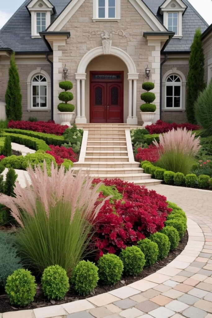 This is a garden that makes a statement! The grasses are a fantastic way to add a layer of texture and height, drawing the eye upwards towards the home’s grand entrance.