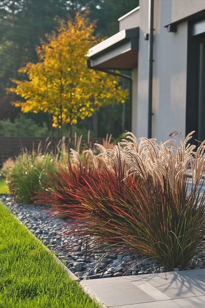 The dark river rocks provide a clean, modern frame for the vibrant plants, making the colors pop even more. To get this look, we recommend choosing a grass variety known for its seasonal color change and planting it in a simple, linear design.