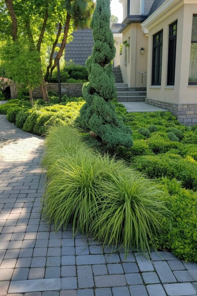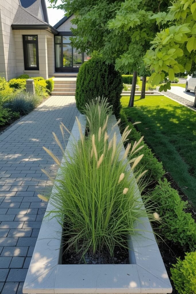 This demonstrates the principle of scale, as the height and volume of the grass are perfectly balanced with the size of the planter and the pathway. The repetition of the pavers and the clipped hedges provides a backdrop that makes the grass truly pop and look like a piece of living sculpture.