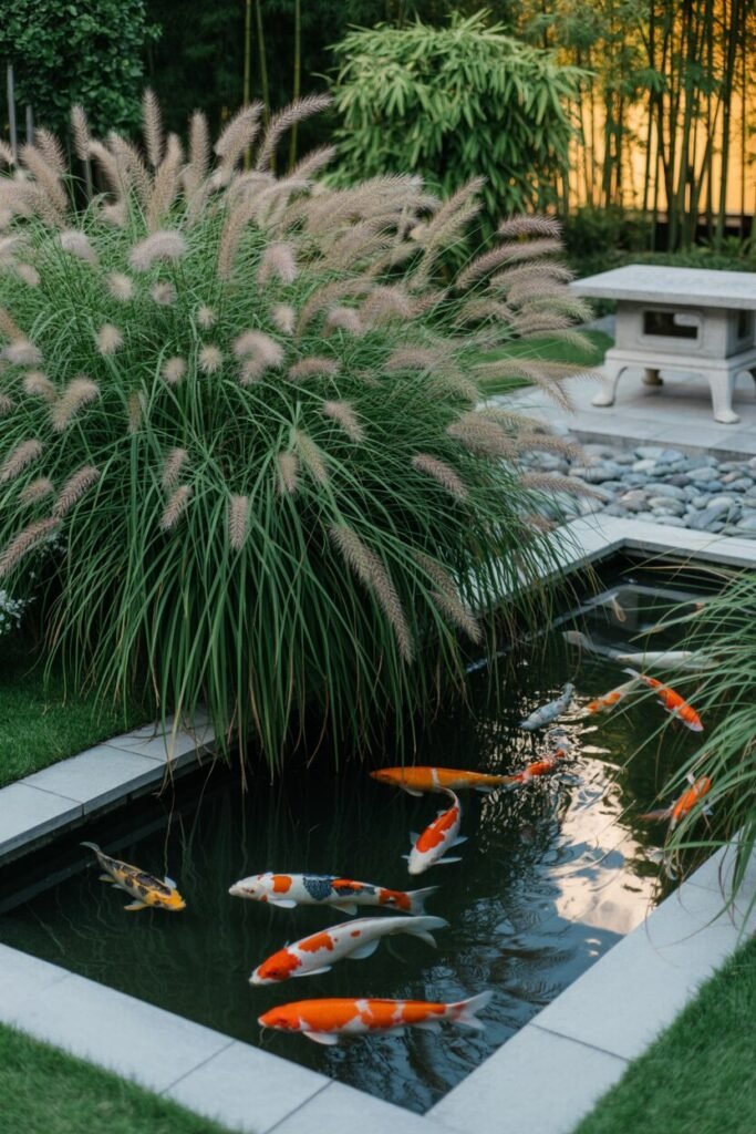 This peaceful garden is a testament to the power of a single plant to define a space. As we’ve learned over the years, the principle of simplicity is key here. A large, fluffy ornamental grass creates a stunning focal point, drawing your attention and softening the edges of the sleek koi pond.