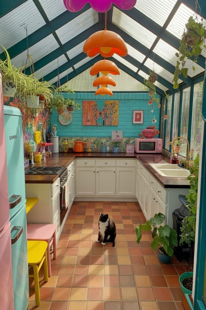 This kitchen is for the people who say “I’ll just add one more color” and then suddenly live inside a kaleidoscope. The vibe is boho maximalism, but in a strategic way—not the “I own everything ever made” direction. Here, color zoning is doing the real work. The turquoise walls, candy-colored appliances, and warm-toned tile floor all hit different notes while still harmonizing because they sit across from each other on the color wheel.