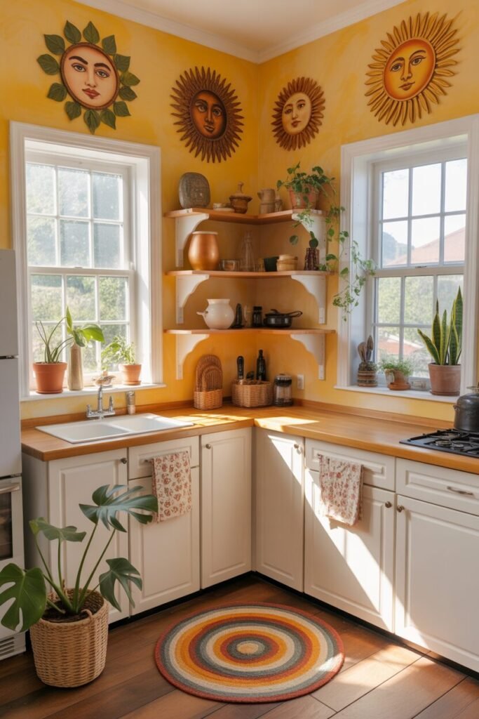 If sunshine had a kitchen, it would look exactly like this. The golden walls instantly set the tone: warm, cheerful, and a little nostalgic in a 70s boho way. What grounds all the brightness is the white cabinetry—it keeps the space from becoming a full sun explosion and gives the eye quiet spots to rest.