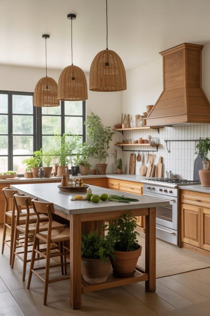 This kitchen screams, “I collect baskets and I’m proud of it.” And honestly? Same. The beauty here is the harmony between rustic structure (wood beams, chunky table, textured rug) and boho softness (wicker pendants, woven stools, natural fibers). The design works because everything stays in the warm-neutral spectrum—no cool grays to break the vibe.