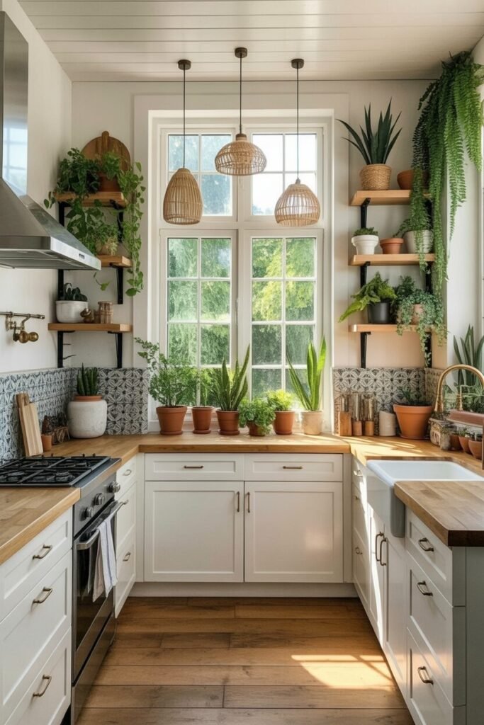 This is where boho meets “I am one with nature.” If you’ve ever wanted your kitchen to feel like it’s breathing with you, welcome to the biophilic boho universe. Plants are doing 70% of the aesthetic work, but what makes this design—not just décor—is the way the greenery interacts with lines, light, and scale.