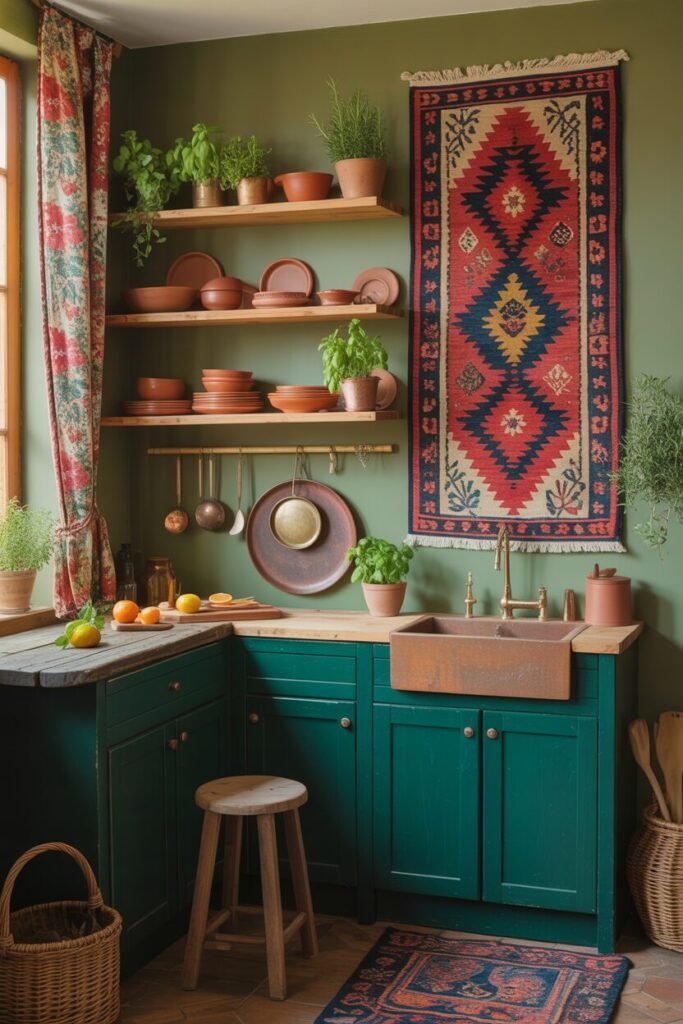 This kitchen is basically the Pinterest definition of “cozy but cultured.” The deep green cabinetry anchors the whole palette, letting the terracotta dishes, copper pans, and the bold kilim rug pop without chaos. The reason this mix works is color temperature harmony—everything leans warm even when the tones are bold.