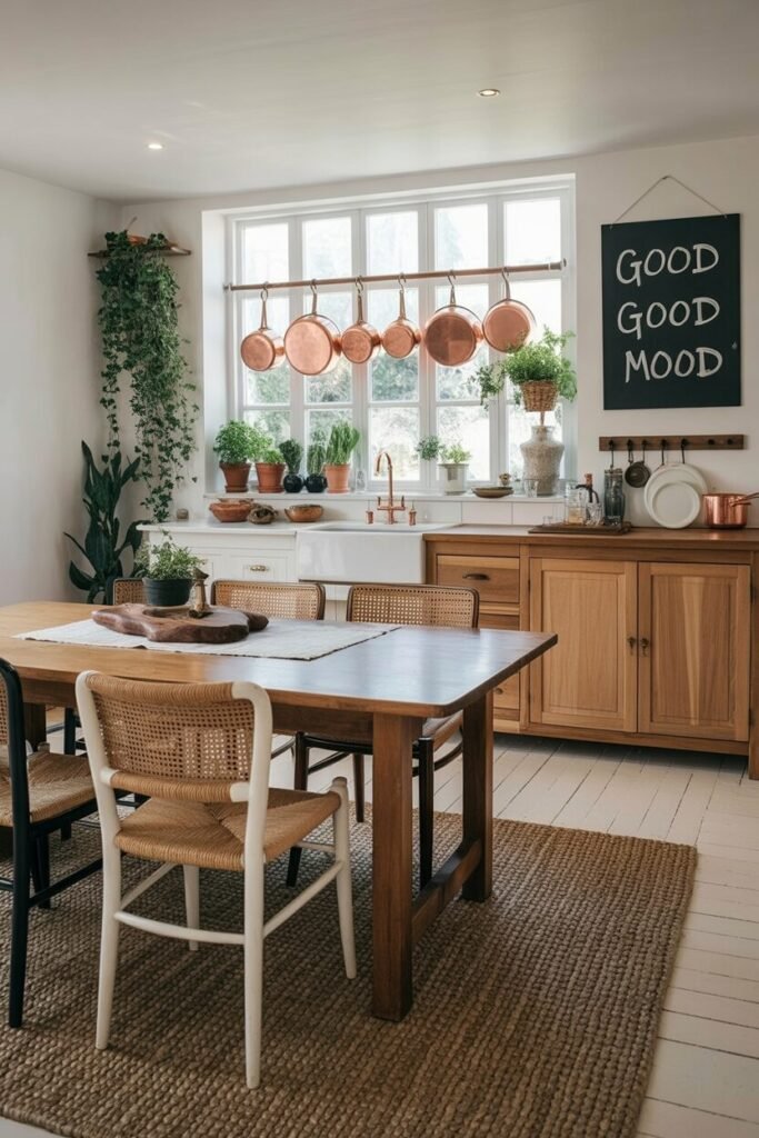 This kitchen-dining hybrid is the friend who always looks effortlessly stylish but promises they “just threw something on.” The copper pots are the star here—they add shine, warmth, and material contrast against all the soft woods and greenery. Hanging them in a straight line creates order in a space that’s otherwise full of relaxed textures. It’s basically functional art.