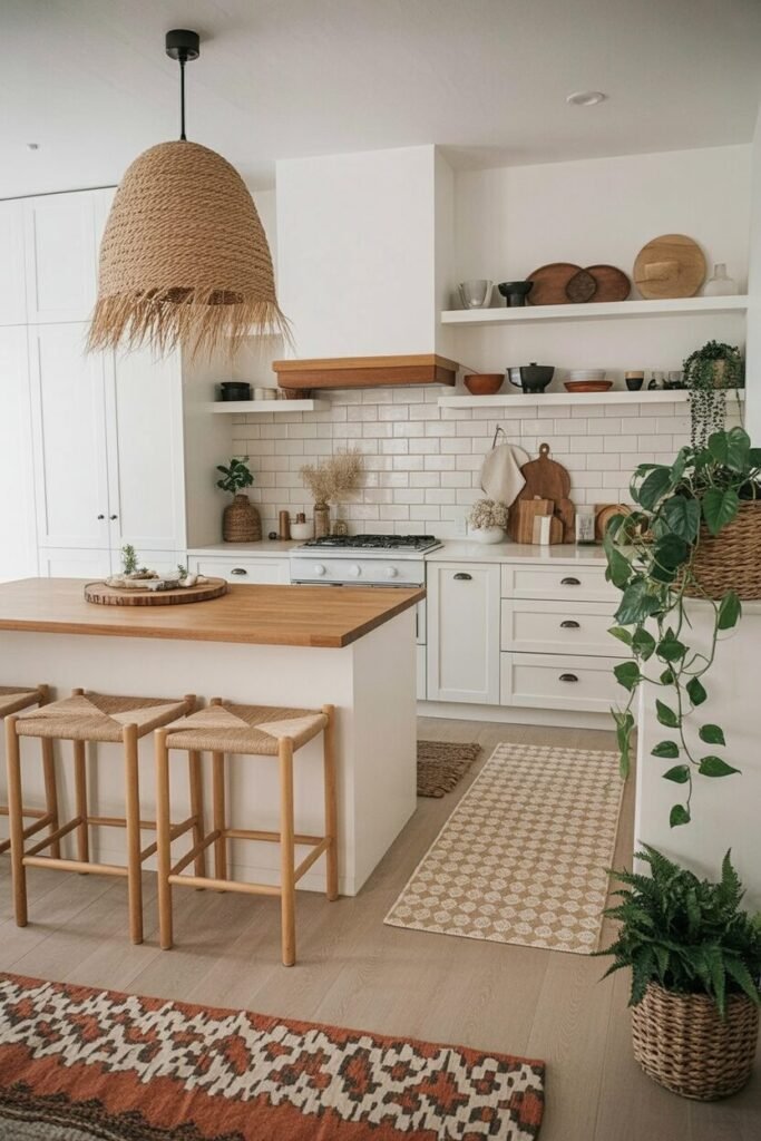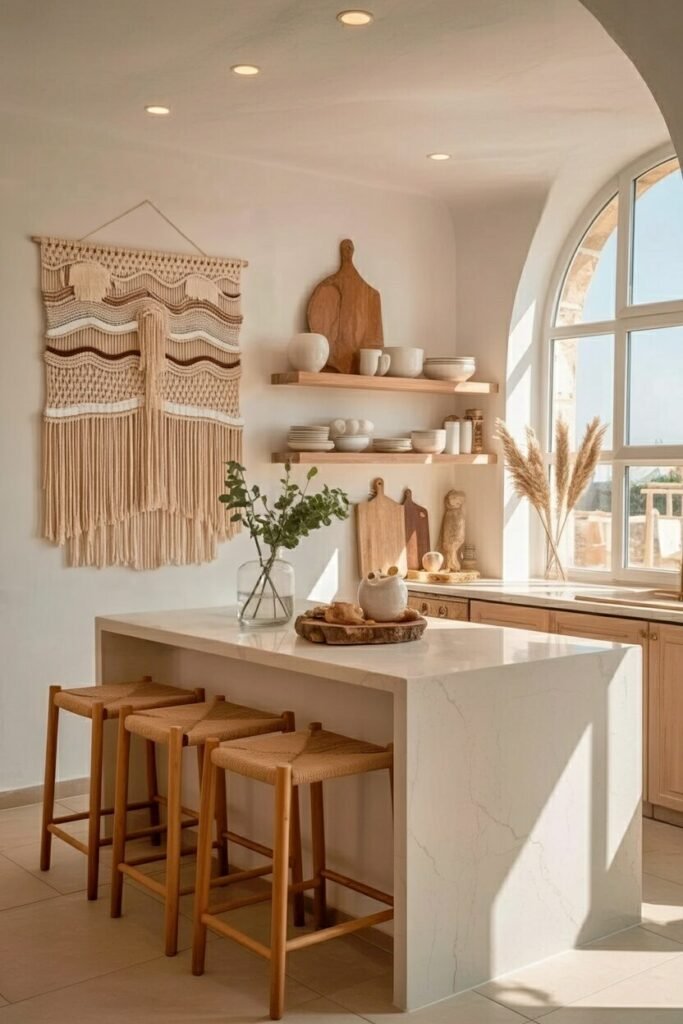 If your dream boho kitchen feels like a warm hug, this is your inspo. The magic of this look comes from neutral tones doing the heavy lifting while textures steal the spotlight. Think: woven stools, a chunky macramé wall hanging, soft curves, and matte finishes. In a neutral palette, texture is basically color, so we want contrast—smooth stone counters beside nubby fibers, sculptural ceramics next to soft woods, all working together for that cozy-boho energy.