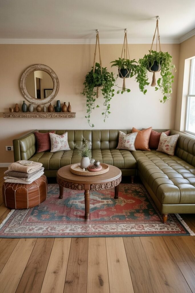 This idea proves that a big sectional doesn’t have to dominate the room if you style the space around it intentionally. The moss-green sofa brings instant earthy grounding, while the hanging plants introduce height and flow. When we recreate this look, the goal is balance through distribution — spreading visual weight throughout the room so nothing feels too heavy in one spot.