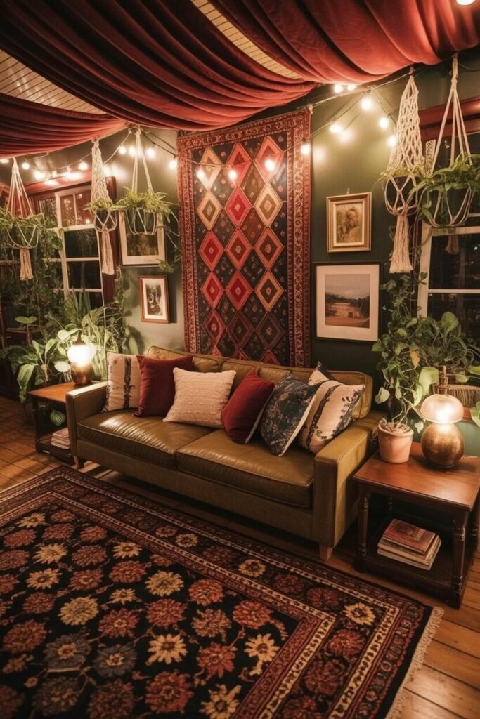 String lights plus table lamps create depth, something overhead lighting alone could never. The tapestry becomes a vertical anchor — basically wall art but with more personality and texture. Plants soften the deep tones so the room stays inviting instead of dungeon-coded.
