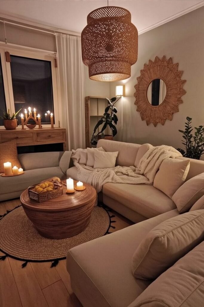 When we recreate this idea, candles become functional design — warm accents that soften every corner, especially when mixed with layered throws. The circular coffee table echoes the circular rug, creating visual harmony without feeling matchy. The trick to copying this look is mixing neutrals with temperature, not color: warm woods, warm fabrics, warm lighting.