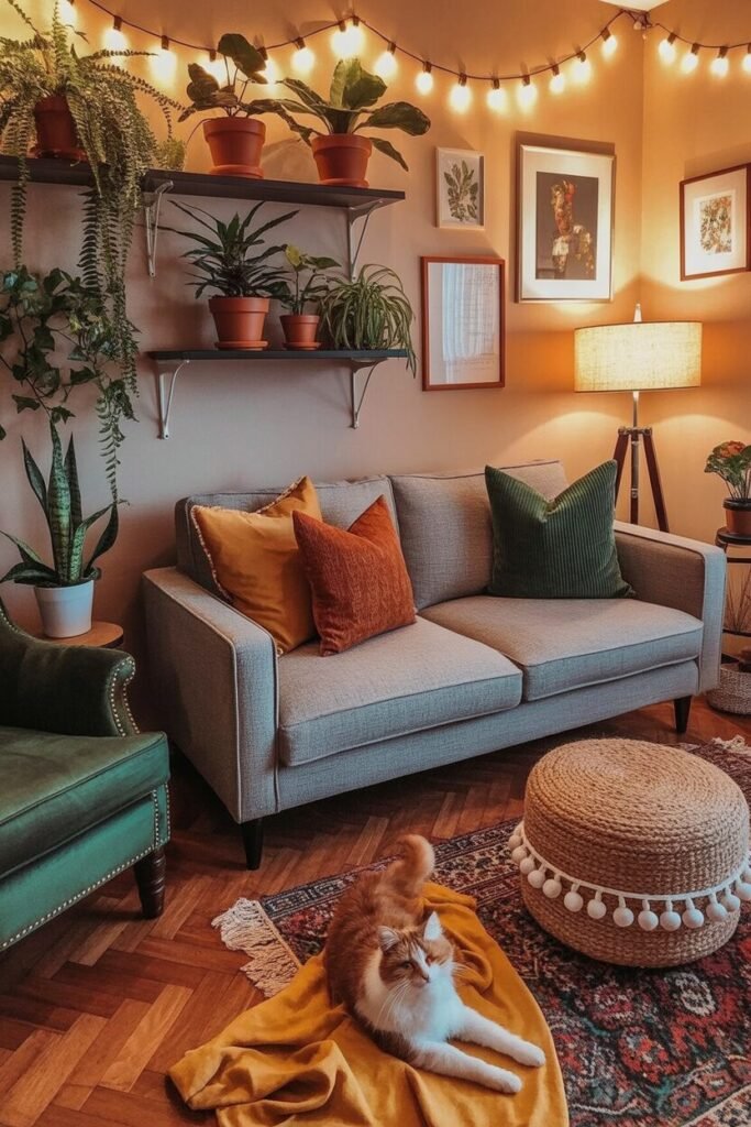 The pillows introduce warm jewel tones that echo the rug, creating subtle repetition. The shelves packed with plants add height and rhythm so the room feels dynamic rather than flat. String lights soften the walls and create that irresistible golden glow.