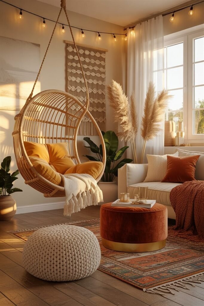 If this room doesn’t make you want a hanging chair immediately, check your pulse. The design works because it mixes motion, softness, and warmth. When we recreate this look, the key principle is flow — the hanging chair introduces literal suspended movement, which instantly energizes the layout.