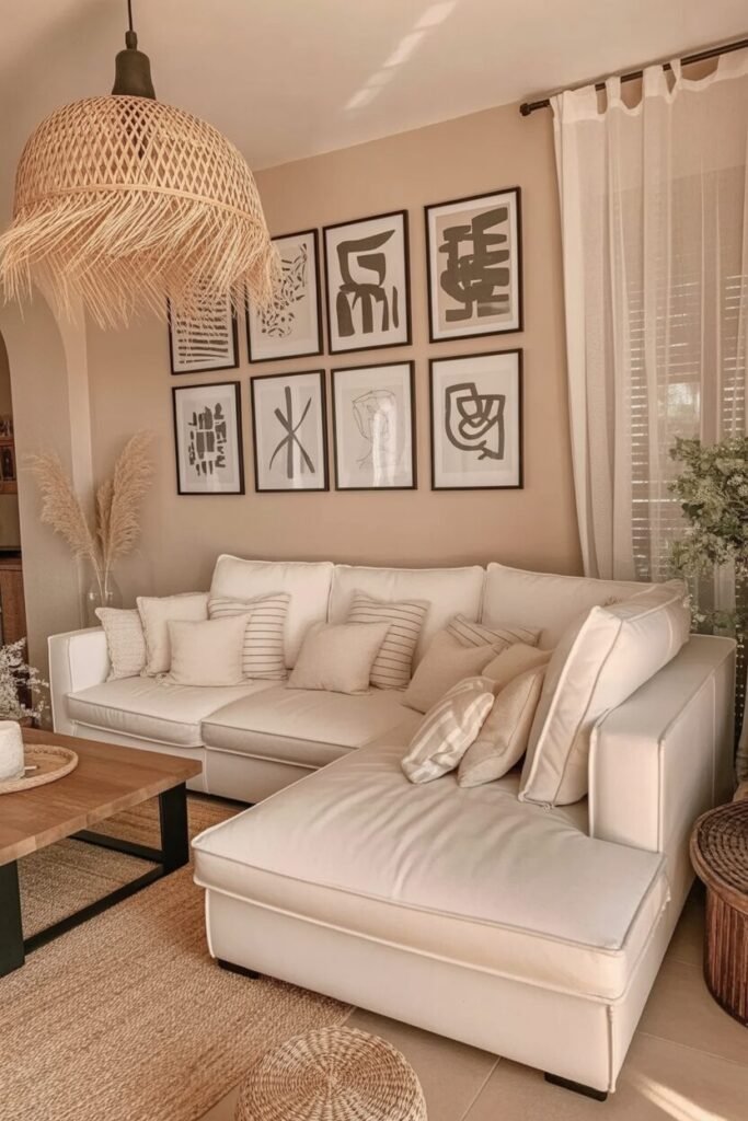 This living room said, “Yes, I’m neutral, but I still have personality.” The sectional creates a clean foundation, allowing the abstract wall art to define the room’s visual identity. When we recreate this idea, the focus is shape language — repeating similar forms across décor so everything feels cohesive.