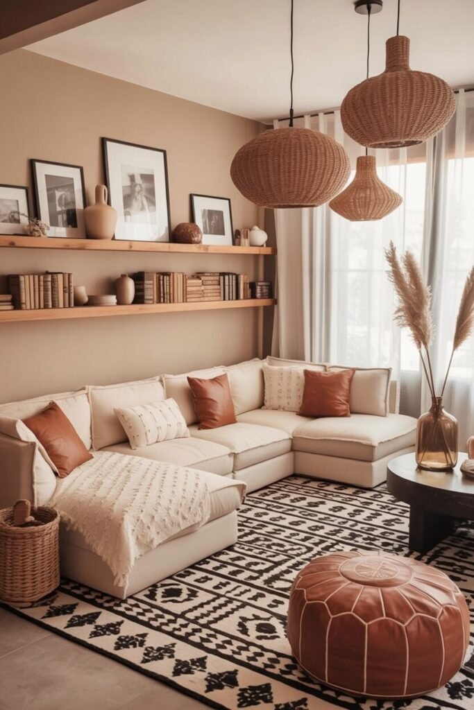 The brown leather pouf adds warmth that softens the geometric rug, creating balance. The gallery shelf is genius: repeating neutral ceramics creates cohesion, while books add vertical weight. Hanging rattan lights bring sculptural warmth overhead, which keeps the room from feeling bottom-heavy.