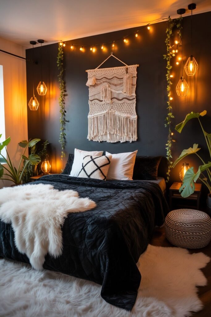 The large macramé piece over the bed adds boho soul, but it also acts as a visual buffer, softening the hard color contrast between wall and bedding. The tapestry-style rug introduces both pattern and movement, which is key when you’re working with dark palettes—patterns prevent visual heaviness.