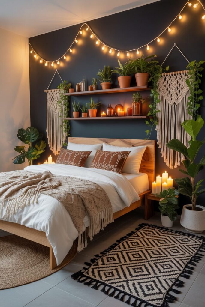 What makes this room work so beautifully is the vertical layering: the shelf sits mid-height, the terracotta pots and candles fill the middle visual band, and the macramé on both sides frames the whole scene like soft boho curtains. The warm glow from candles and fairy lights creates an amber haze that settles perfectly over the greenery, turning harsh shadows into soft gradients.
