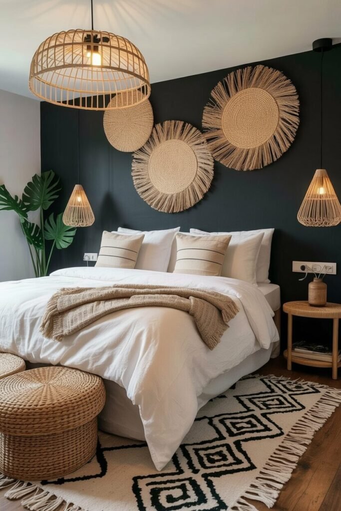 This bedroom shows exactly how dark walls can feel warm instead of intimidating when you surround them with generous natural textures. The woven wall plates instantly soften the deep backdrop, and their circular forms add a sense of movement that keeps the wall from feeling flat or overly severe.