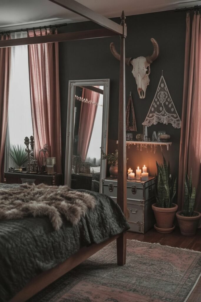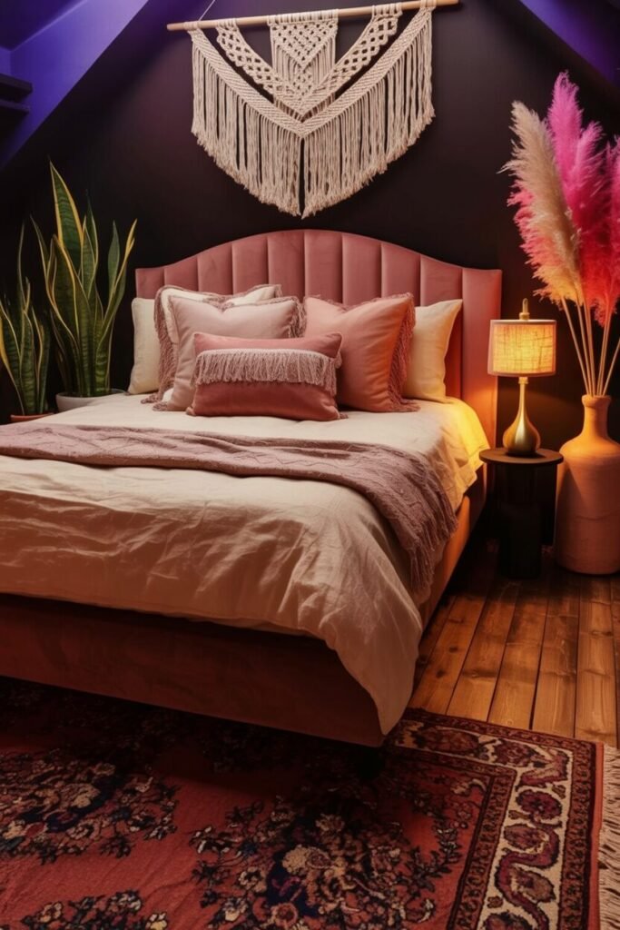 This look proves that dark boho doesn’t always have to stay neutral—you can absolutely throw in color without throwing off the whole vibe. The muted pink headboard is the star here because it offers softness and warmth without fighting the dark walls.