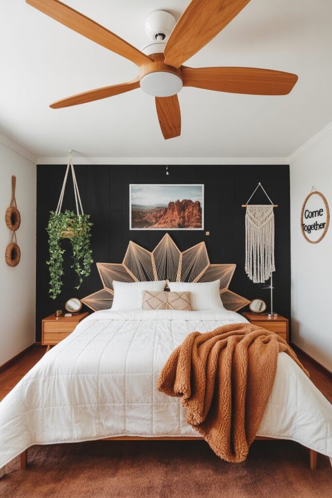This look proves that boho doesn’t always mean chaotic or overly layered—sometimes it’s organized boho with a side of geometry. The show-stopper is the string-art-style headboard that delivers instant symmetry and structure. It’s basically the visual equivalent of contouring your bedroom.