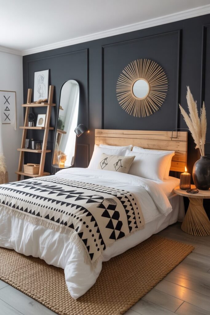 This bedroom leans into the “clean boho” aesthetic where every piece has purpose and the dark wall becomes a sophisticated frame instead of a dramatic statement. The paneled wall adds subtle architecture that elevates the room without needing busy decor, while the sunburst mirror brings a sculptural focal point that feels both boho and modern.
