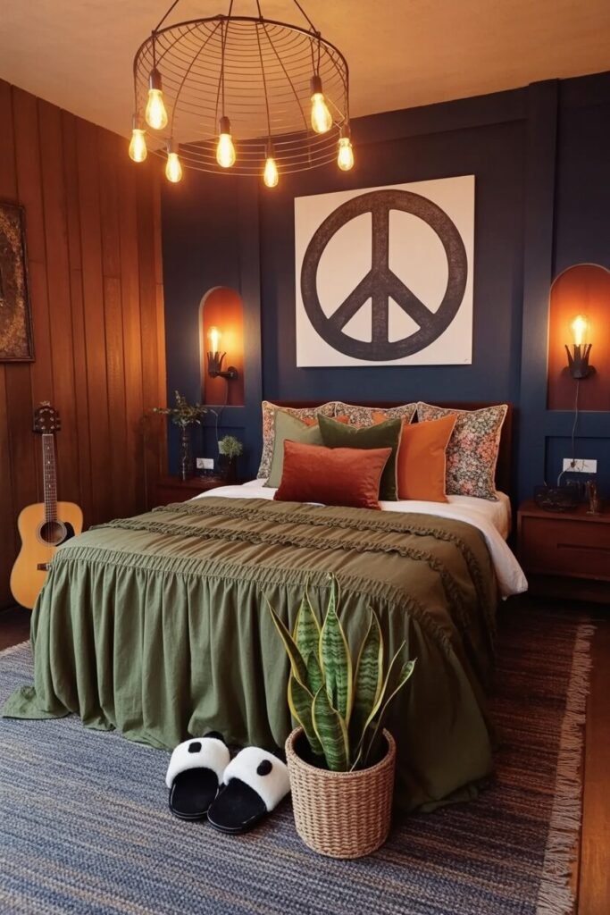 This bedroom brings together peace signs, navy walls, warm bulbs, and retro textures—AKA the recipe for “cool but cozy.” The deep navy acts as a moody canvas, but the warm lighting creates a temperature contrast that makes the space feel inviting instead of intense.
