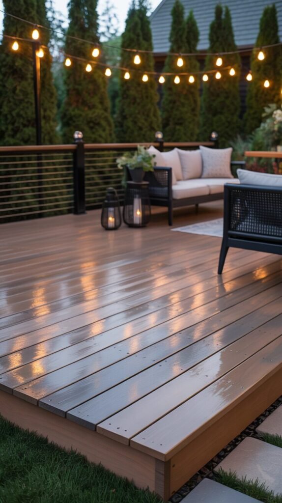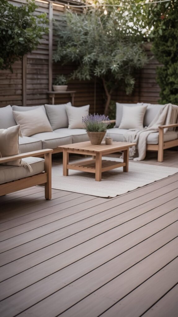 There is weathered taupe too. It gets the cedar warmth without making the deck a walk-in fridge. Call taupe the soul of warm-cool marriage—a restrained, desaturated brown-gray that just yells visual balance. Warm greens and muted accents in the photo almost cancel out the deck’s neutral color to create a rich, fabulously inviting picture. It’s especially nice with those creamy siding houses, natural landscaping, or that oh-so-country farmhouse aesthetic.