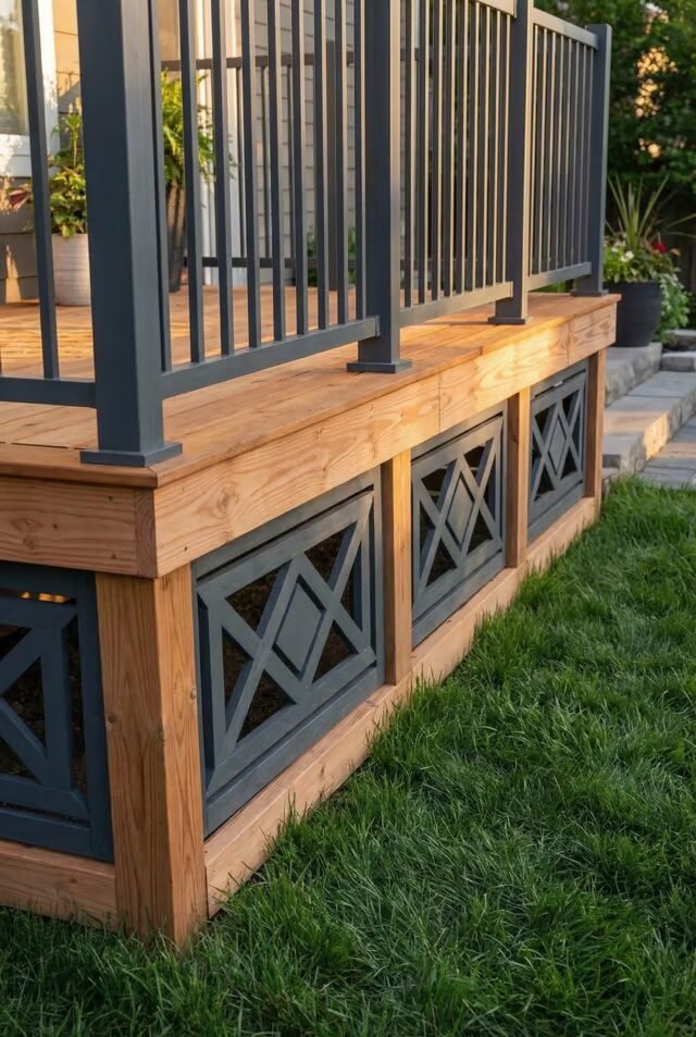 The clean vertical balusters keep the look modern and visually light, while the lattice skirt adds texture without stealing attention. If you’re recreating this, choose a railing color that appears elsewhere, maybe in planters or cushions, for cohesion. The wood lattice underneath is genius because it hides the structure while allowing airflow. Plants at the base soften all those straight lines and introduce organic movement.